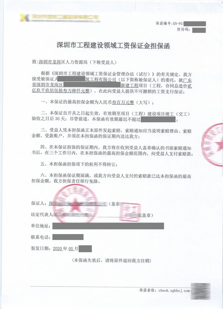 根据《深圳市工程建设领域工资保证金管理办法(试行)》(深人社规〔2018〕17号)规定,自2018年12月1日起,深圳市所有在建工程及新建工程项目施工总承包企业需按照要求及时缴存工资保证金,并将相应担保材料(即银行保函、保险机构保单保函或建设单位担保等第三方担保材料)提交所在区人力资源部门。为确保龙岗区各施工总承包企业在缴纳工资保证金后,能及时提交担保材料,现将担保材料具体提交流程公布如下: