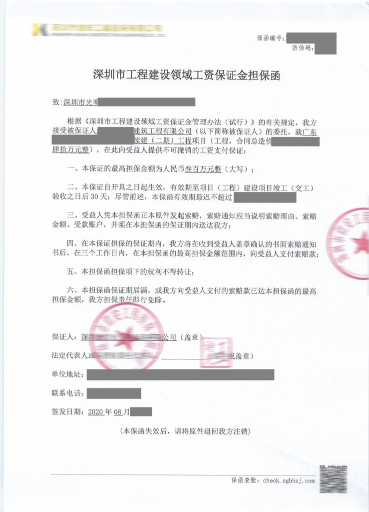 办理过程 收集 营业执照复印件盖章,法代身份证复印件盖章,合同复印件盖章,委托担保协议书复印件盖章,确认保函格式后,我司发送付款通知书,收到款项后出具深圳市工程建设领域工资保证金担保函。出函后2天内寄出保函原件和发票。