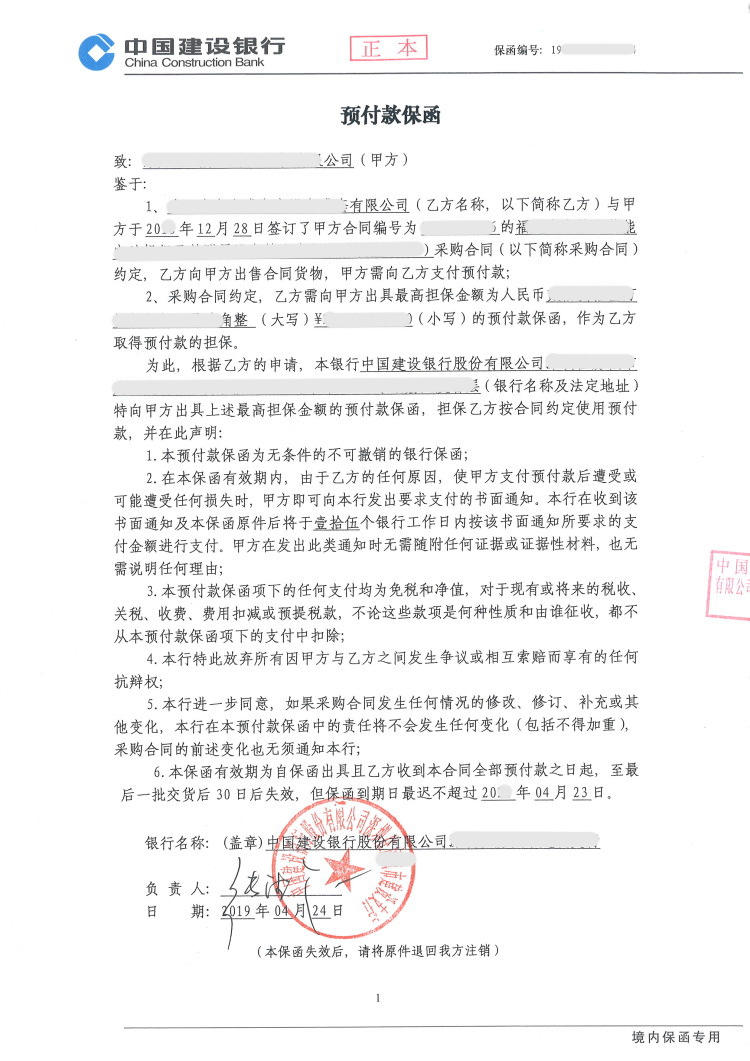又称还款保函,还款保证书, 定金保函, 预付金保函,指担保人(银行)根据申请人(合同中的预收款人,通常情况下是出口商)的要求向受益人(合同中的预付款人,通常是进口商)开立的,保证一旦申请人未能履约,或者未能全部履约,将在收到受益人提出的索赔后向其返还该预付款的书面保证承诺。 预付款保函在国际承包业务中使用时,是由承包人通过银行向业主提供。保证书规定,如申请人不履行他与受益人订立的合同的义务,不将受益人预付、支付的款项退还或还款给受益人,则由银行向受益人退还该款项。预付款保函主要是用来保证预付款的专款专用。